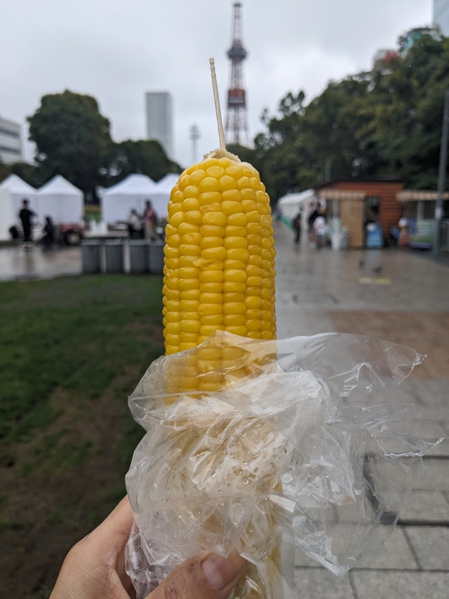 アツアツで甘くて、美味しい。つまようじが付いてて、熱いからこれで刺して持つのかな?とか思ってたけど、食べ終わった後、とうもろこしの繊維が前歯に挟まってて、つまようじはこのためやったんか、と納得。